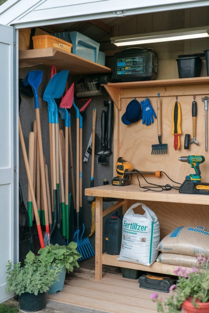 Install wall hooks for long-handled tools like spades and rakes. Pegboards are excellent for smaller hand tools because they’re flexible and easy to rearrange. Shelving units can hold pots, watering cans, and storage boxes without cluttering the floor.