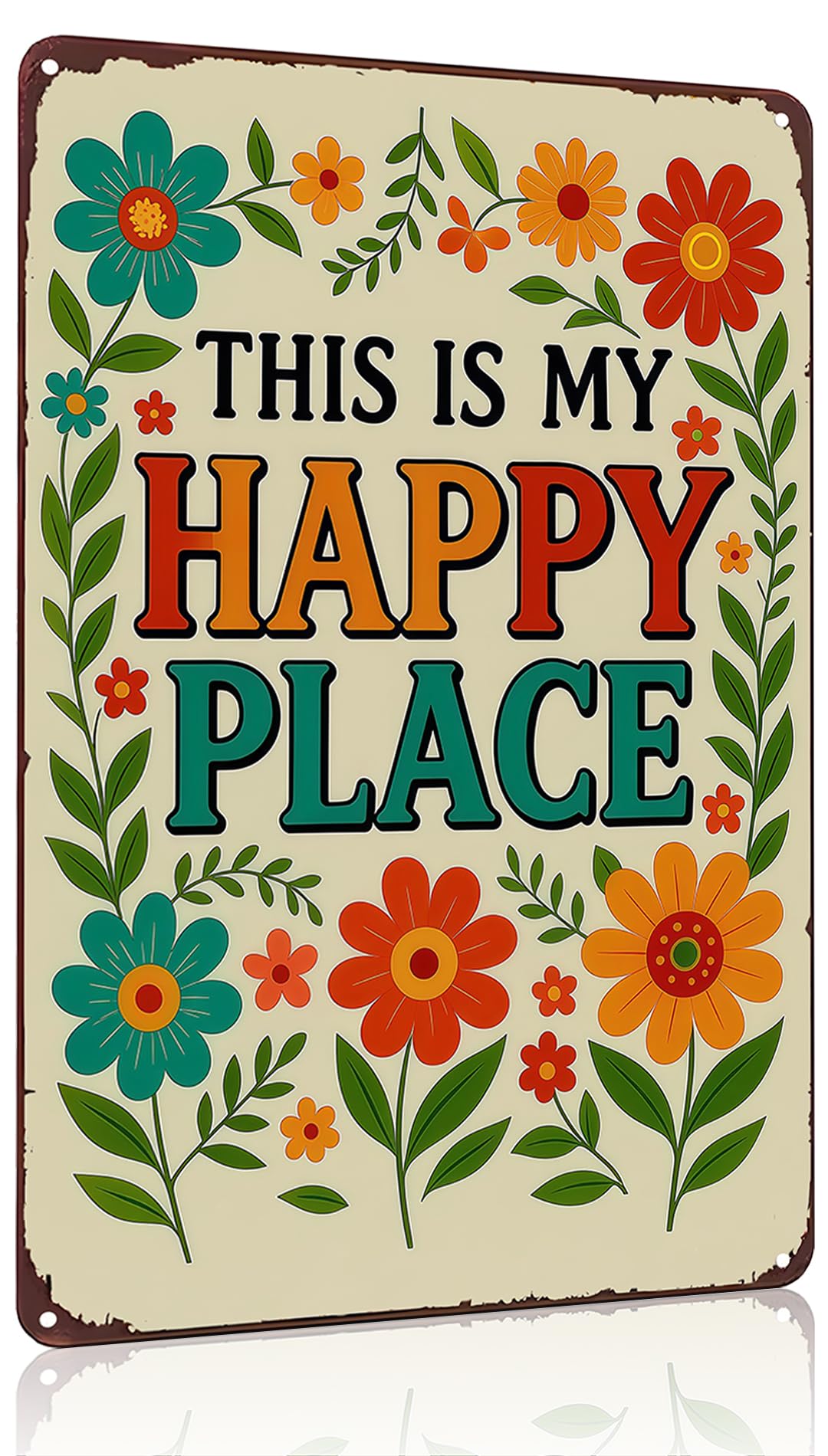 We put this sign up near our flower bed, and it really lifts the space with its bold colors. The mix of teal, red, and orange flowers around the “Happy Place” text feels lively without being overwhelming.